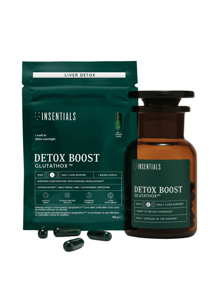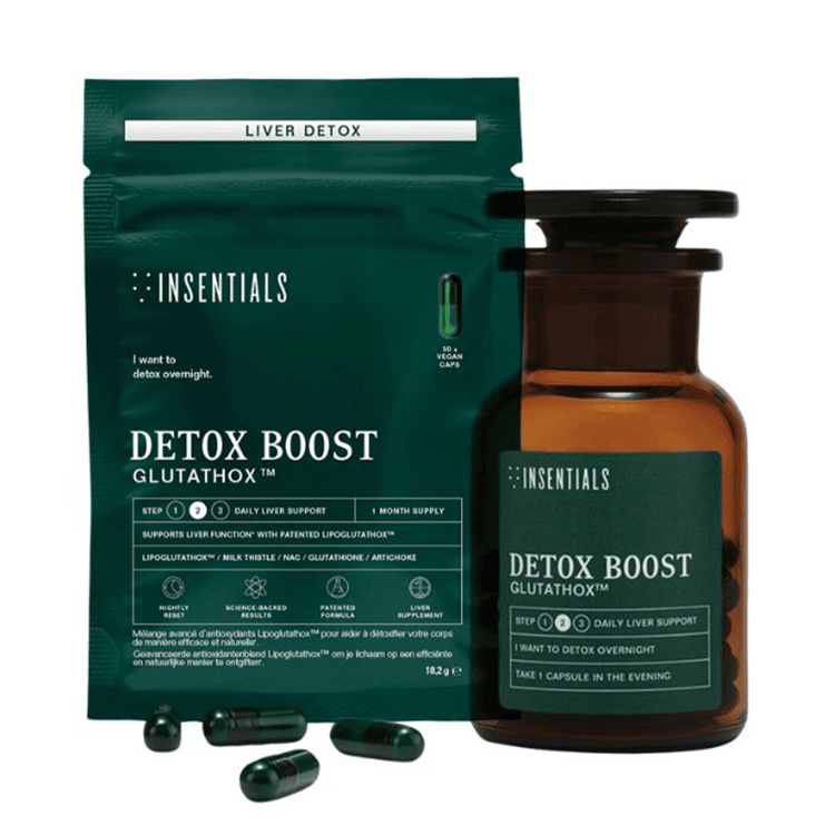 Detox Boost by Insentials is an advanced formula developed for daily liver support. The Lipoglutathox™ blend combines milk thistle, choline, NAC, artichoke and glutathione. These ingredients help support the body’s natural detoxification processes and contribute to normal liver function. Packaged in a practical jar with refill pack for long-term and more sustainable use.