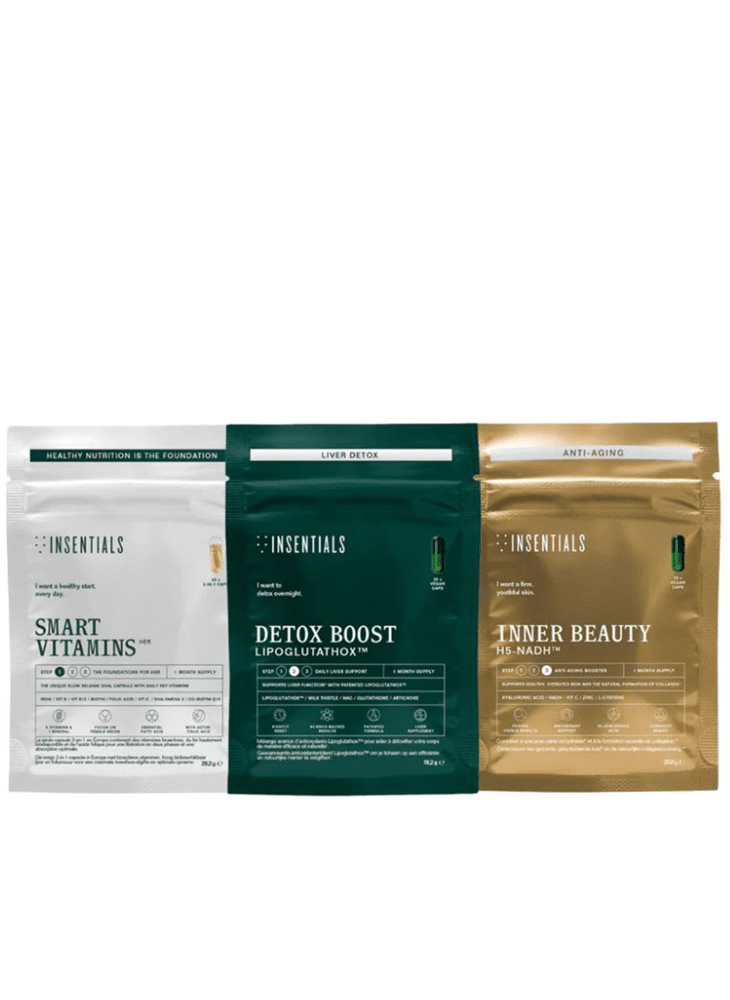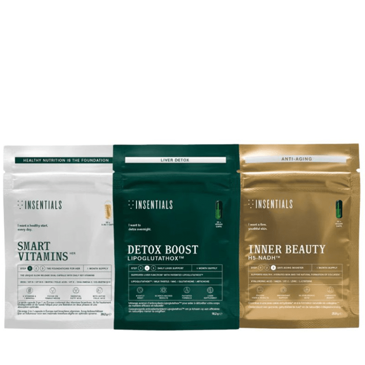 The Inner Beauty Routine Pack by Insentials combines several supplements in a structured 3-step routine for inner skin support. The approach starts with essential micronutrients, followed by liver and detox support, and finishes with targeted skin formulas. Together, these supplements complement cellular skin vitality, hydration and a healthy-looking glow.