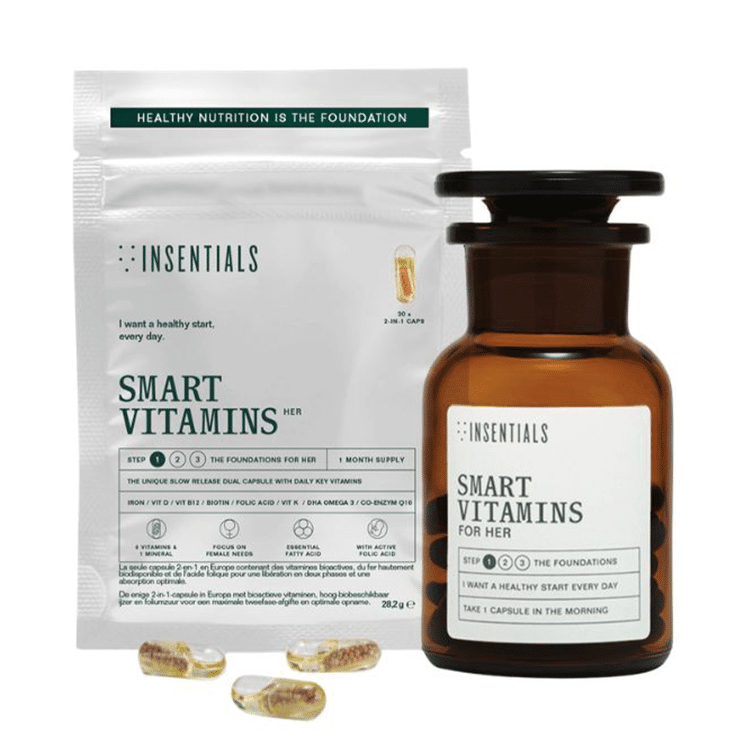 Insentials Smart Vitamins For Her is a unique slow-release duo capsule in a jar with refill pack, designed for daily support tailored to women.