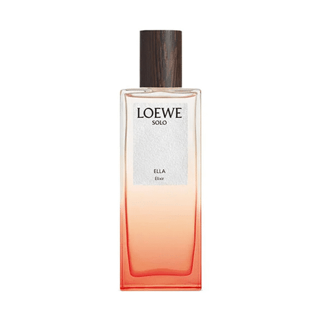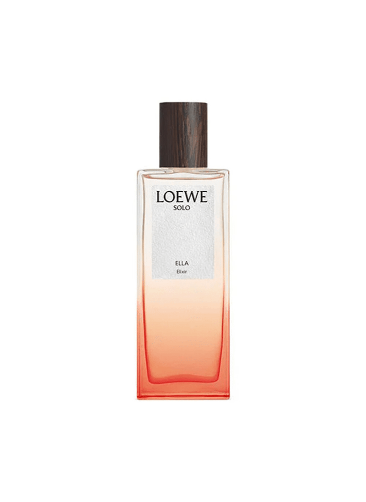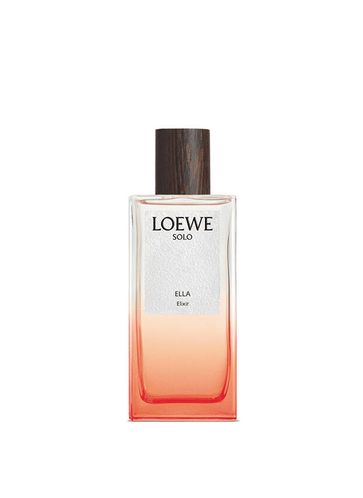 LOEWE Solo is a family of fragrances inspired by sunset a state of balance and equilibrium where night meets day and opposites harmonise LOEWE Solo Ella Elixir EDP comes encapsulated in a glass flask in a gradient of orange, echoing the bottle of its original iteration, and finished with a wooden cap.