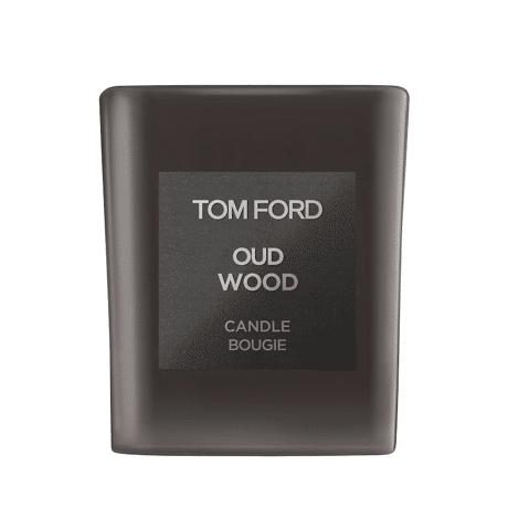 A scented candle with the woody, spicy scent of Oud Wood.