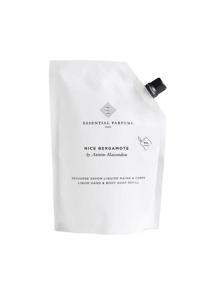 Vloeibare lichaams- en handzeep navulling, subtiel geparfumeerd met Nice Bergamote door Antoine Maisondieu – 98% natuurlijk.