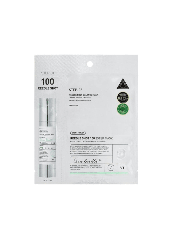 Het VT Cosmetics Mild Reedle Shot 100 2 Step Balance Mask is ontwikkeld om je huid intensief te hydrateren, te kalmeren en te revitaliseren. Dit innovatieve 2-stappen masker biedt een luxe spa-ervaring voor thuis en is ideaal voor de gevoelige huid. De combinatie van een lichte serum-essence en een ademend sheetmask zorgt voor een frisse, soepele en stralende teint.