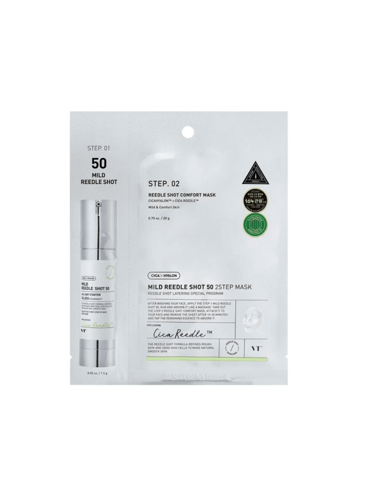 Het VT Cosmetics Mild Reedle Shot 50 2 Step Mask biedt een revolutionaire aanpak binnen skincare door de werking van een krachtig serum te combineren met de intensieve verzorging van een sheetmask. Deze 2-staps behandeling hydrateert diep, egaliseert de teint en helpt fijne lijntjes en rimpels te verminderen. Het resultaat is een frisse, stralende en jeugdige huid.